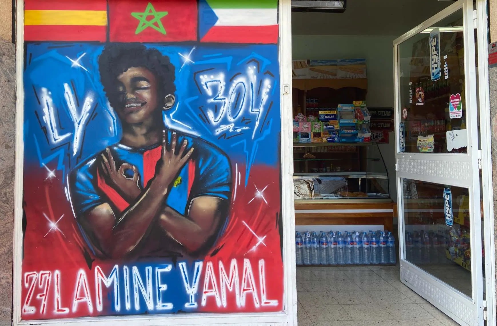 La persiana del forn aràbic regentat per l'Abdul, el tiet de Lamine Yamal. A la pintada també hi ha la bandera espanyola, la marroquina i la de Guinea Equatorial, en referència als orígens del jugador / Javier Martín i Marc Barraca