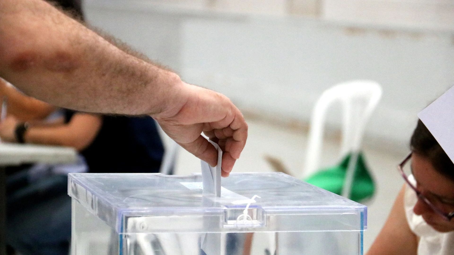 Un votant diposita el sobre del vot a l'urna d'una de les meses habilitades al pavelló del barri de la Bordeta de Lleida / Alba Mor (ACN)