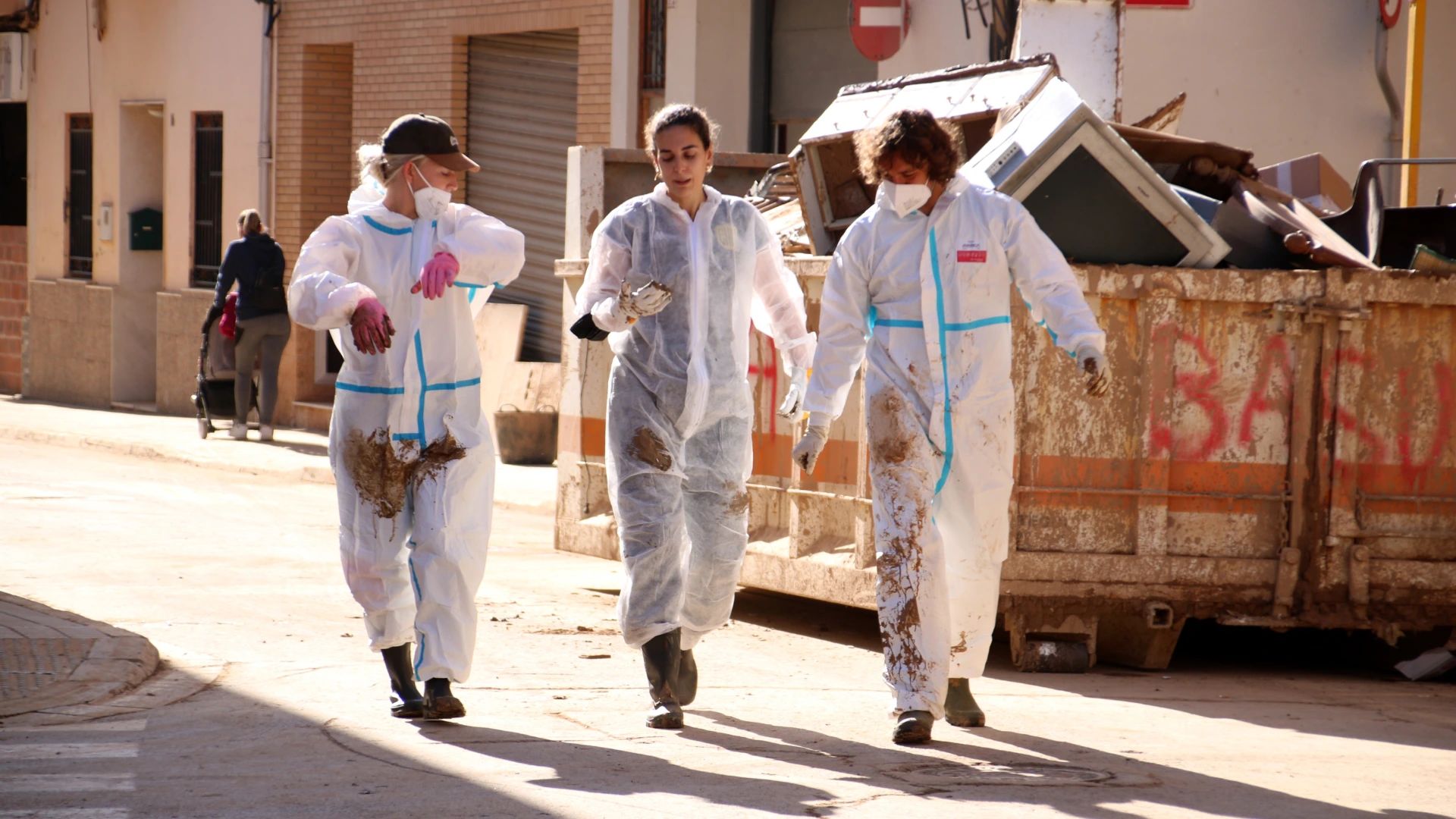 Tres voluntaris després de llençar trastos danyats en un contenidor a Paiporta, al novembre / Nil Escolà i Mar Rovira (ACN)
