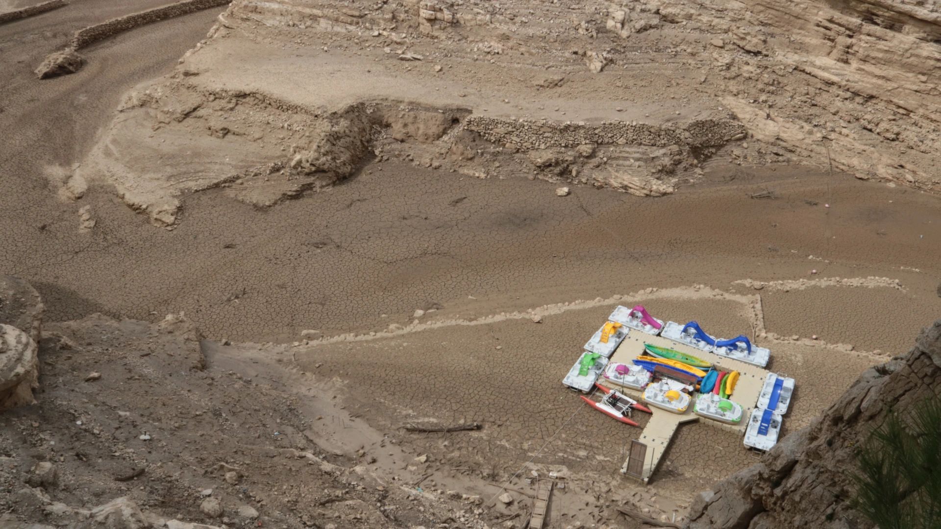 L'embarcador de kayaks i canoes del restaurant Molí l'Abad, al fons del pantà d'Ulldecona a causa de la sequera / Ariadna Escoda (ACN)