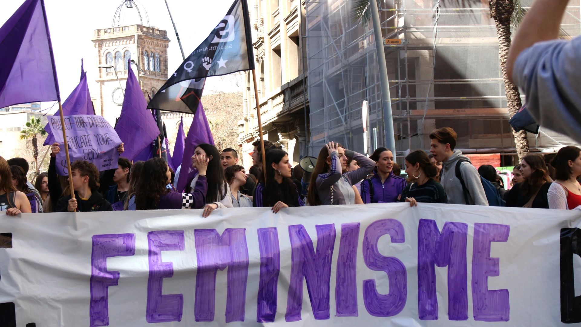 Pancarta del SEPC on s'hi pot llegir "Feminisme" a la manifestació estudiantil del 8-M a Barcelona / Albert Hernàndez i Arnau Martínez (ACN)