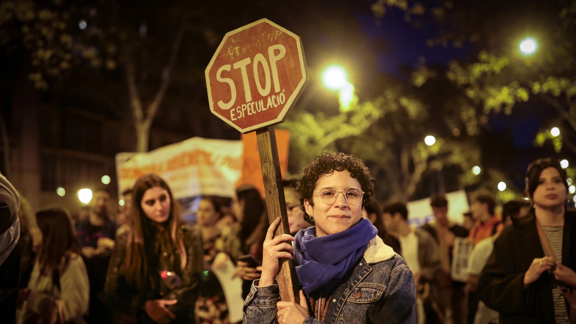 Una noia amb un lema 'Stop especulació' a la manifestació / Jordi Borràs (ACN)