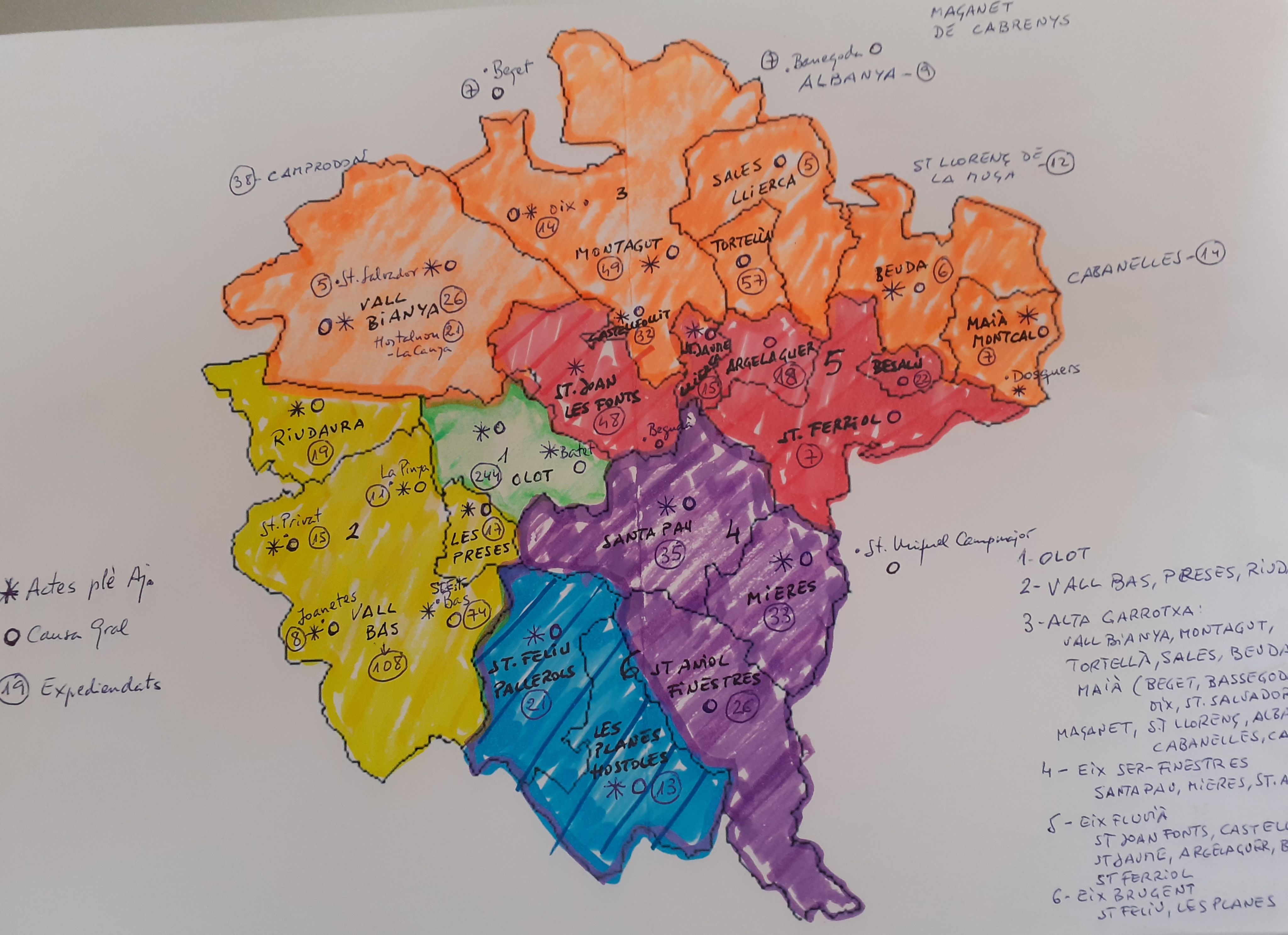 Com que el projecte està ambientat en els temps de la Guerra Civil, és important tenir en compte que antigament les divisions territorials no eren les mateixes. Actualment la Garrotxa té 21 municipis, però l’any 1936 en tenia un total de 30, explica la santjoanenca al DdB.