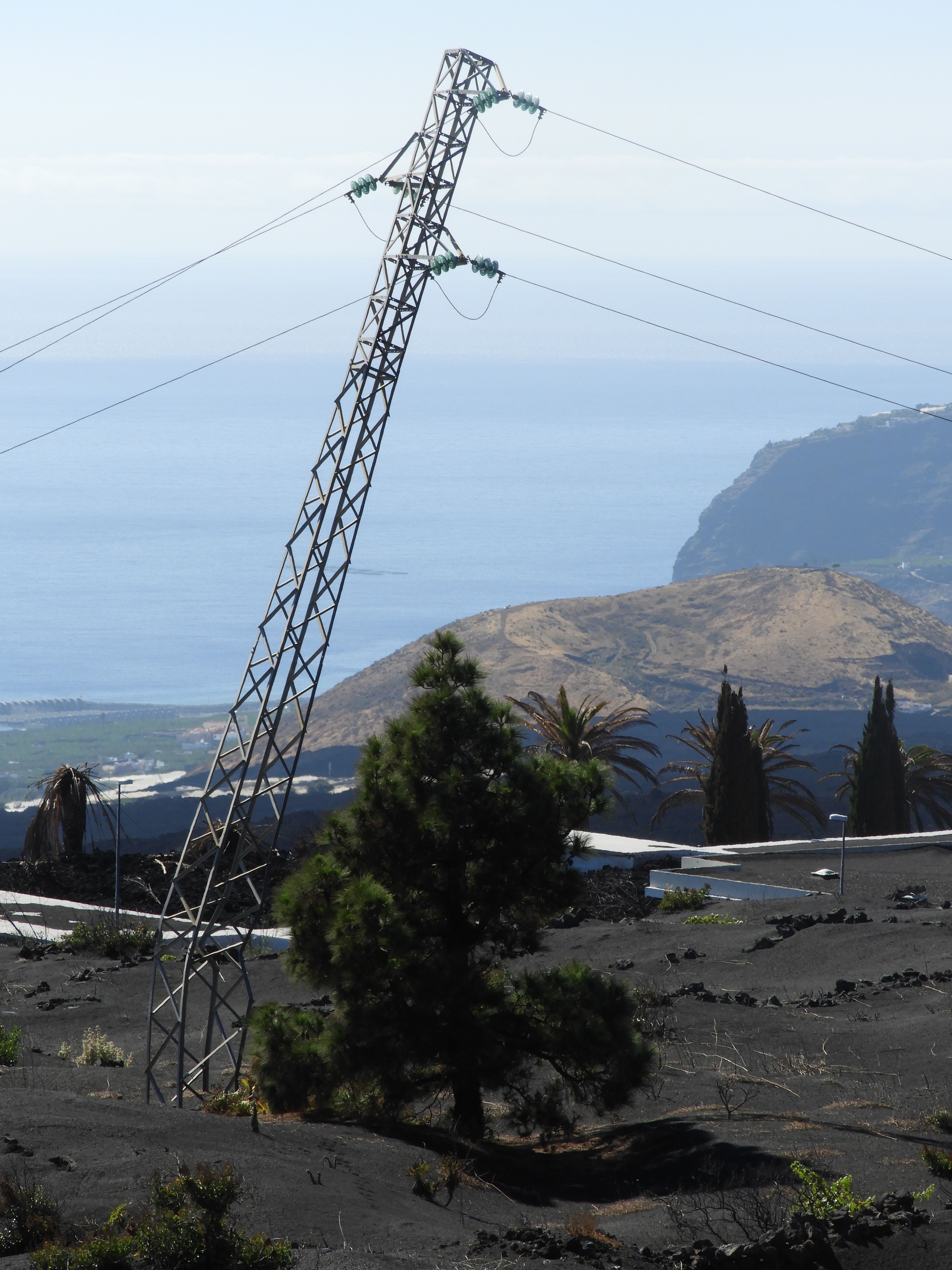 Moltes de les destrosses van ser provocades pel mateix pes de les cendres, que es fan encara més feixugues en contactar amb la pluja. Els cables d’aquest pal de llum van cedir, i l’acumulació de cendra a sobre seu acabà per doblegar la torre de ferro: el veïnat va quedar sense llum.