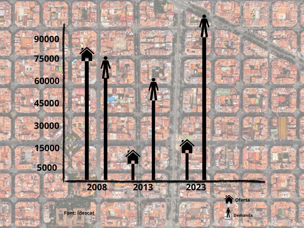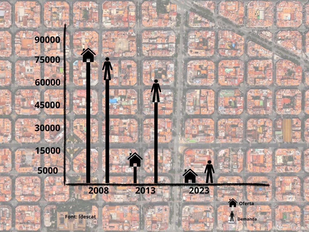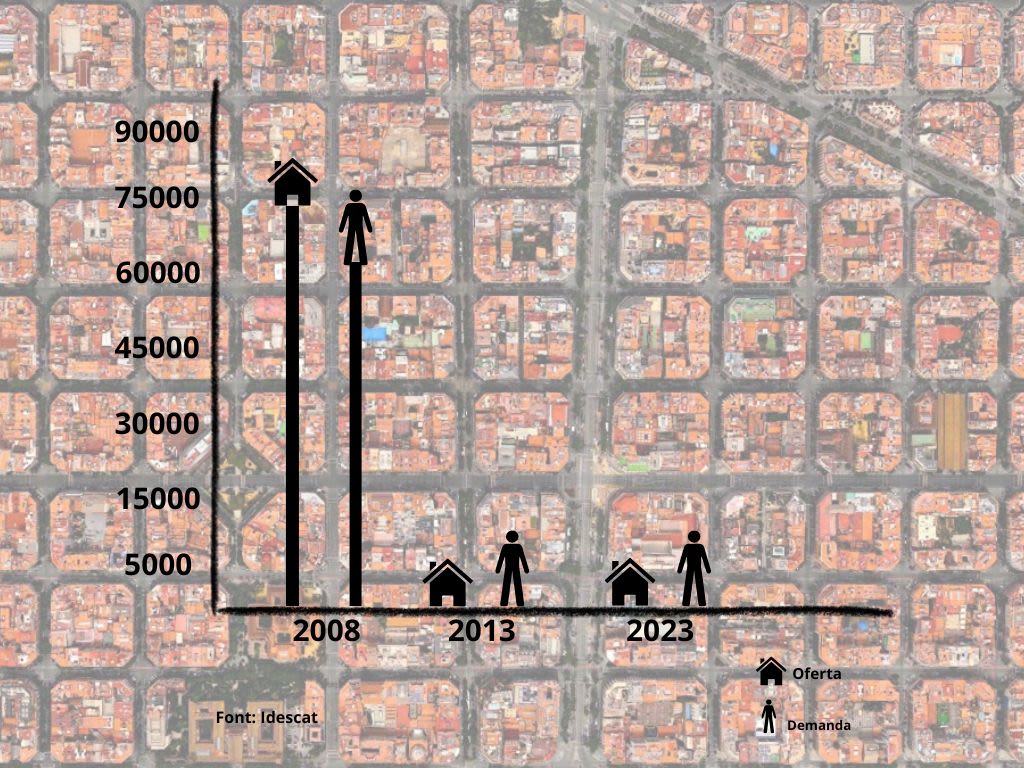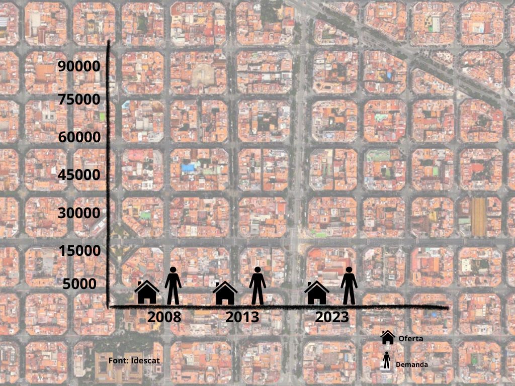 Fa 10 anys la gent que tenia 35 anys, el 70% eren propietaris. Ara són el 34%. El què explica la gran baixada, és la inaccessibilitat. Quan la bombolla immobiliària es trenca, els preus baixen però no tens la possibilitat d’accedir al 100% del crèdit com es tenia fins al moment. Per tant, tota la demanda jove es trasllada al mercat de lloguer, sense capacitat de reaccionar amb termes d’oferta. Pugen preus i es crea aquesta inaccessibilitat.