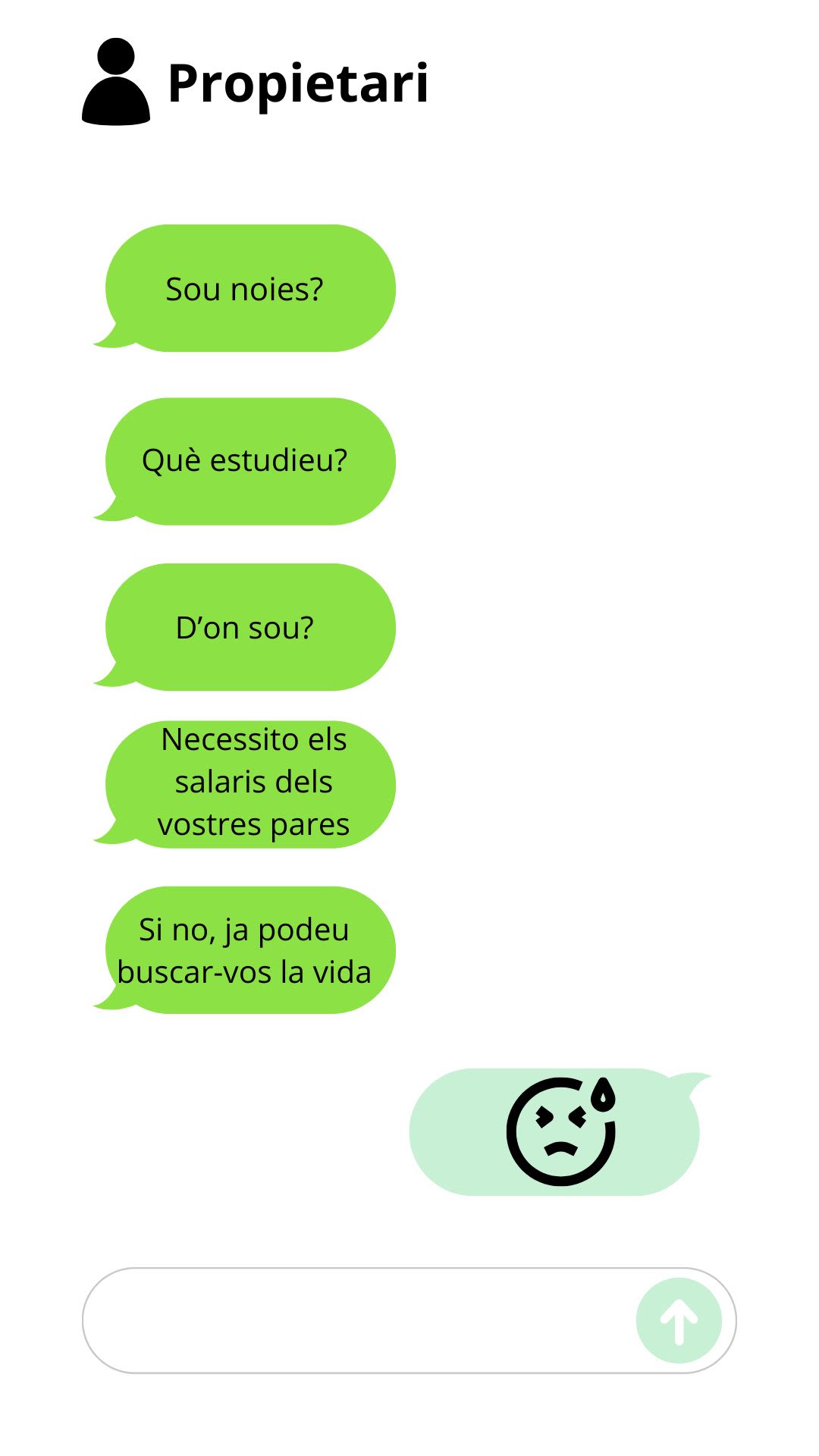 Trobar pis s’ha convertit en un procés de selecció exquisit. El propietari posa els seus requisits, i ets tu qui ha d’encaixar amb aquests. Si ets noia, t’obrim les portes. Si estudies dret o empresa, benvinguda. Ara bé, si ets noi i estudies art, porta tancada de bat a bat. Ara bé, tot i passar la fase de preelecció, encara et queda tot el camí per recórrer, com és el cas de la Clàudia. Tot i ser noia i estudiar en el món de la sanitat, tampoc ha estat fàcil per ella: “Va ser una experiència frustrant. Recordo estar a ple agost, de vacances, plorant, trucant a tot arreu perquè ens demanaven nòmines, el meu pare és autònom i ens posaven mil i un problemes per justificar que podria pagar el pis. O sigui fatal”.