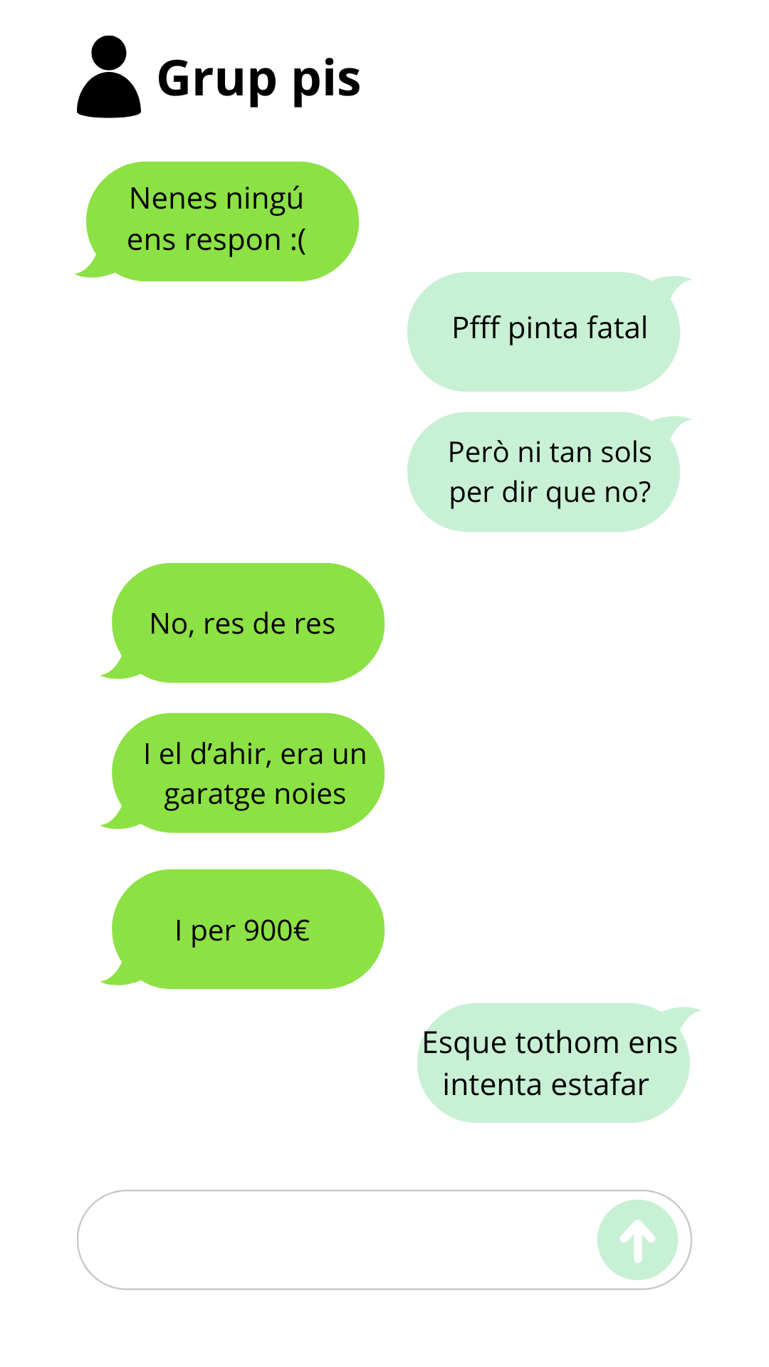 I de sobte, un cop de sort: “Nenes m’ha contestat una noia que busca llogar un pis urgentment”. I encara que, de vegades ho donem tot per perdut, les noies van decidir donar-li una oportunitat: “Va ser la primera vegada que algú ens contactava a nosaltres”. I va ser així com, després de tres llargs mesos d’estafes, temps malgastat i esperances perdudes, un 15 d’agost, van trobar pis. Tres habitacions, un lavabo, molta llum natural i sense mobles; no era el que esperaven, però era un pis. No es trobaven davant d’una ganga, ja que cada una havia de pagar 370 euros de lloguer, amb despeses a part, més 2000 euros de fiança inicial. Però tenien pis.